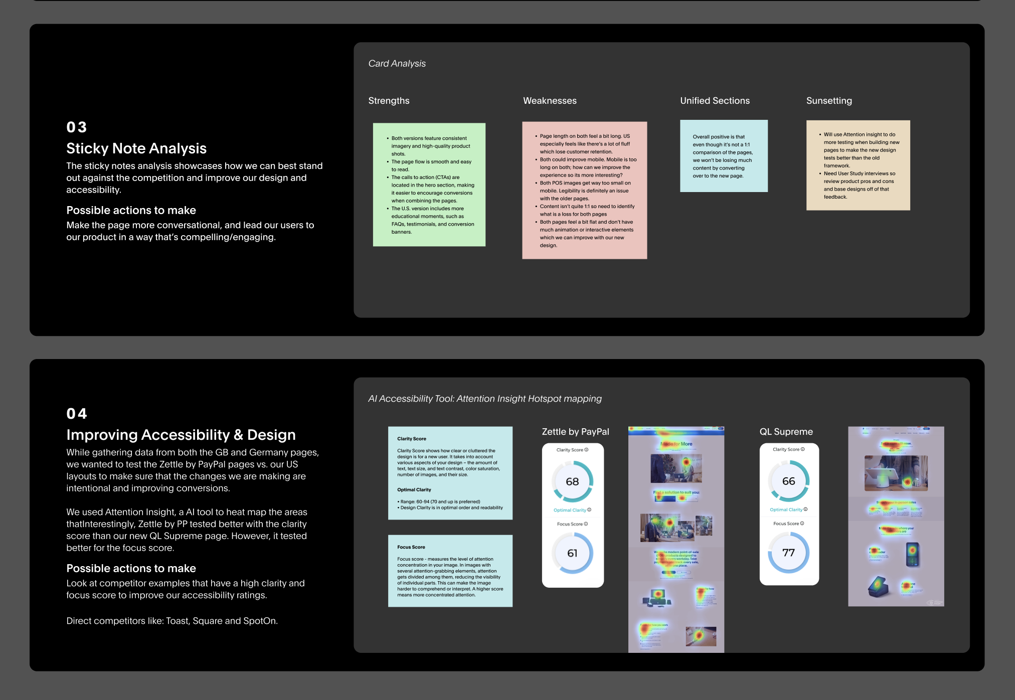 We analyzed the Zettle by PayPal experience against U.S. POS pages using Attention Insight heatmaps to assess layout performance. This evaluation highlighted strong visual clarity in Zettle, but noted that key elements like product value and merchant proof points were often positioned too far down the page. Additionally, reviewing competitors such as Square, Toast, and SpotOn revealed opportunities to enhance hierarchy, accessibility, and conversion paths.