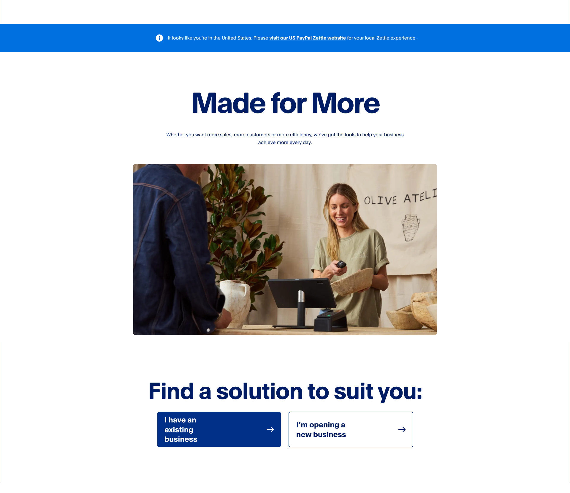 The Zettle Handshake page examined ways to connect the Zettle brand with the overall PayPal experience. Although the page was not launched because of Zettle's strong brand recognition in Europe, it was created as a potential lead-generation concept.